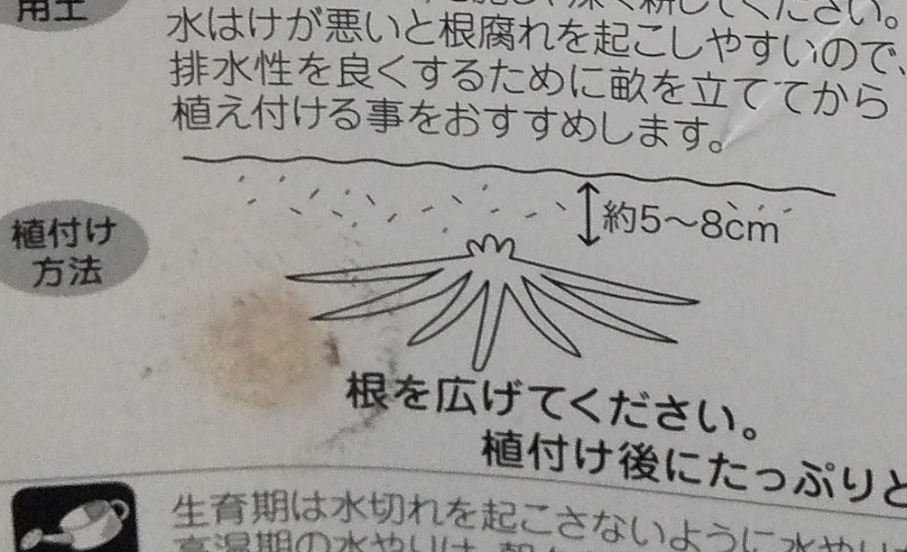 苗のタグに書いてあったイラストの真似をして、根を広げて2株並べて植えました。