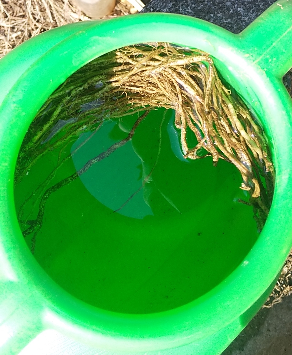 バケツが近くになかったので、とりあえずジョロにて水浴。長時間浸けてはいけないとも書いてあったので10分弱で、取り出し。