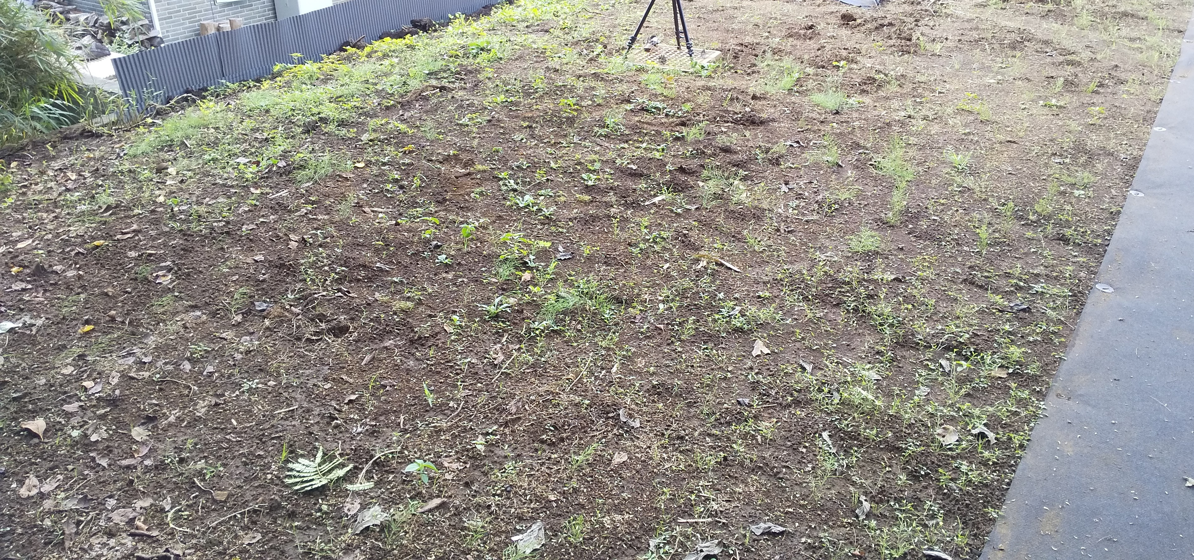 ついでに家の横部分、法面に土止めで段差を作ったところの下段。シルバープリペットとヤエヤマブキの間のエリアにもヘアリーベッチまきました。