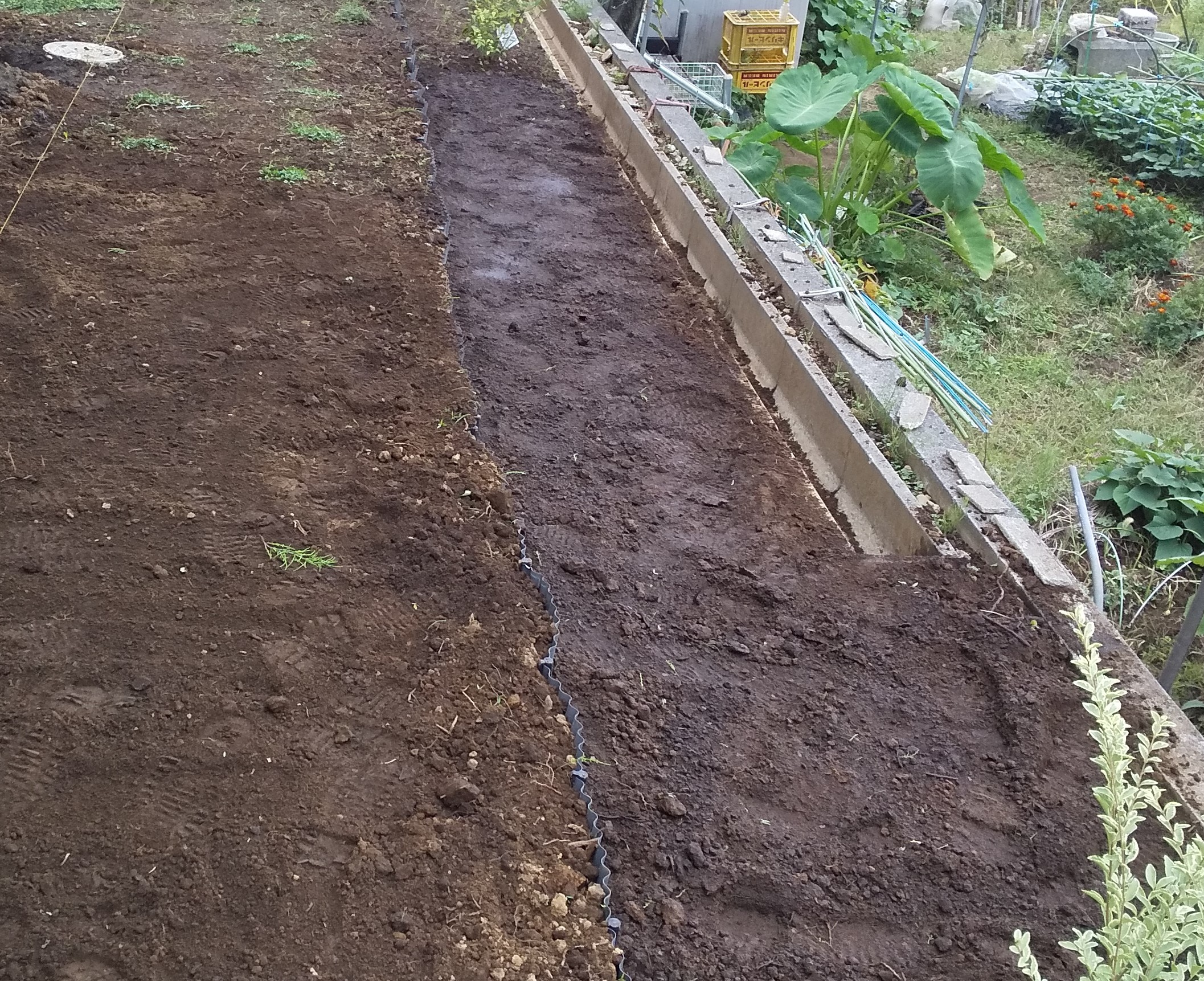 毎度ですが、ヘアリーベッチは播種後も水をやらなくても大丈夫らしいのですが、鎮圧が雑なので、一応全面的に水をかけました。