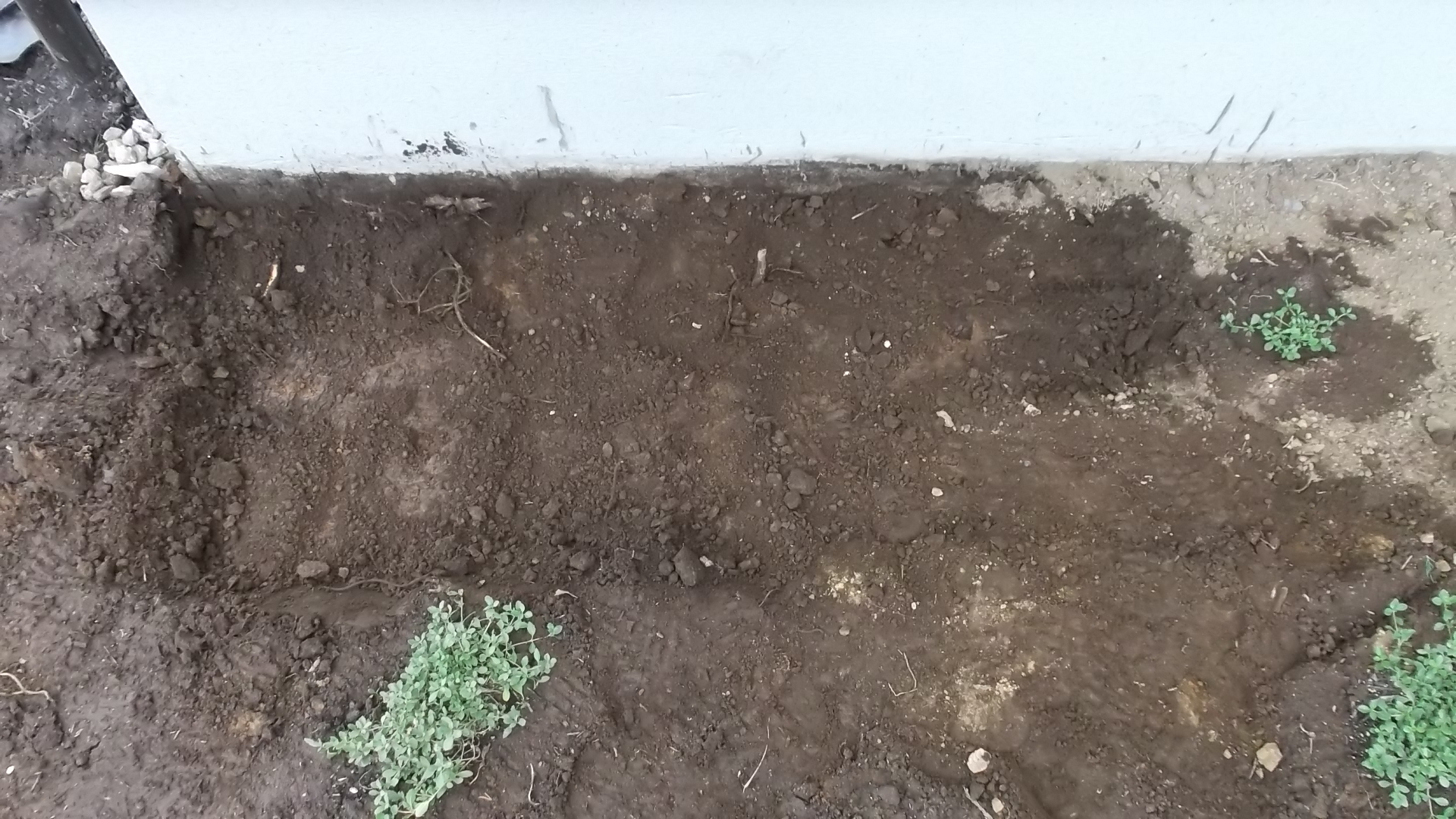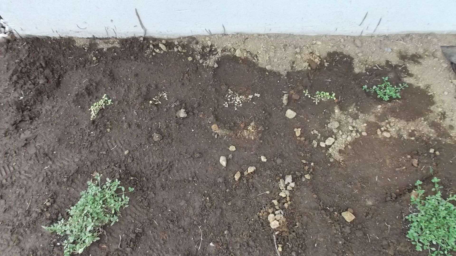 ここは家のふちで軒下になる場所。家の近くまでクラピアが早く来るように、小さい苗をあえて近づけて並べて植えた場所ですが、軒下なので、雨がほとんどかからないと思われます。