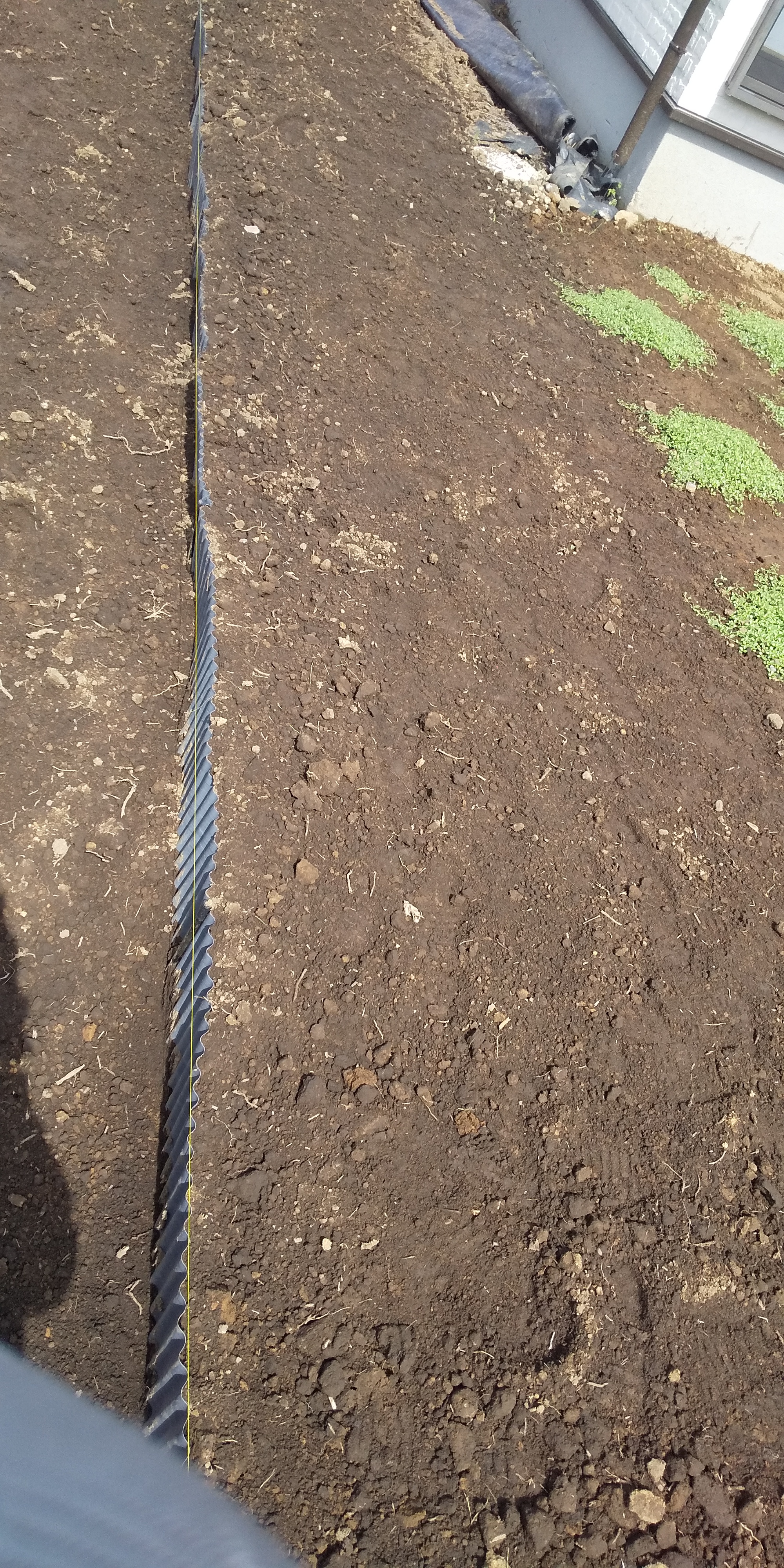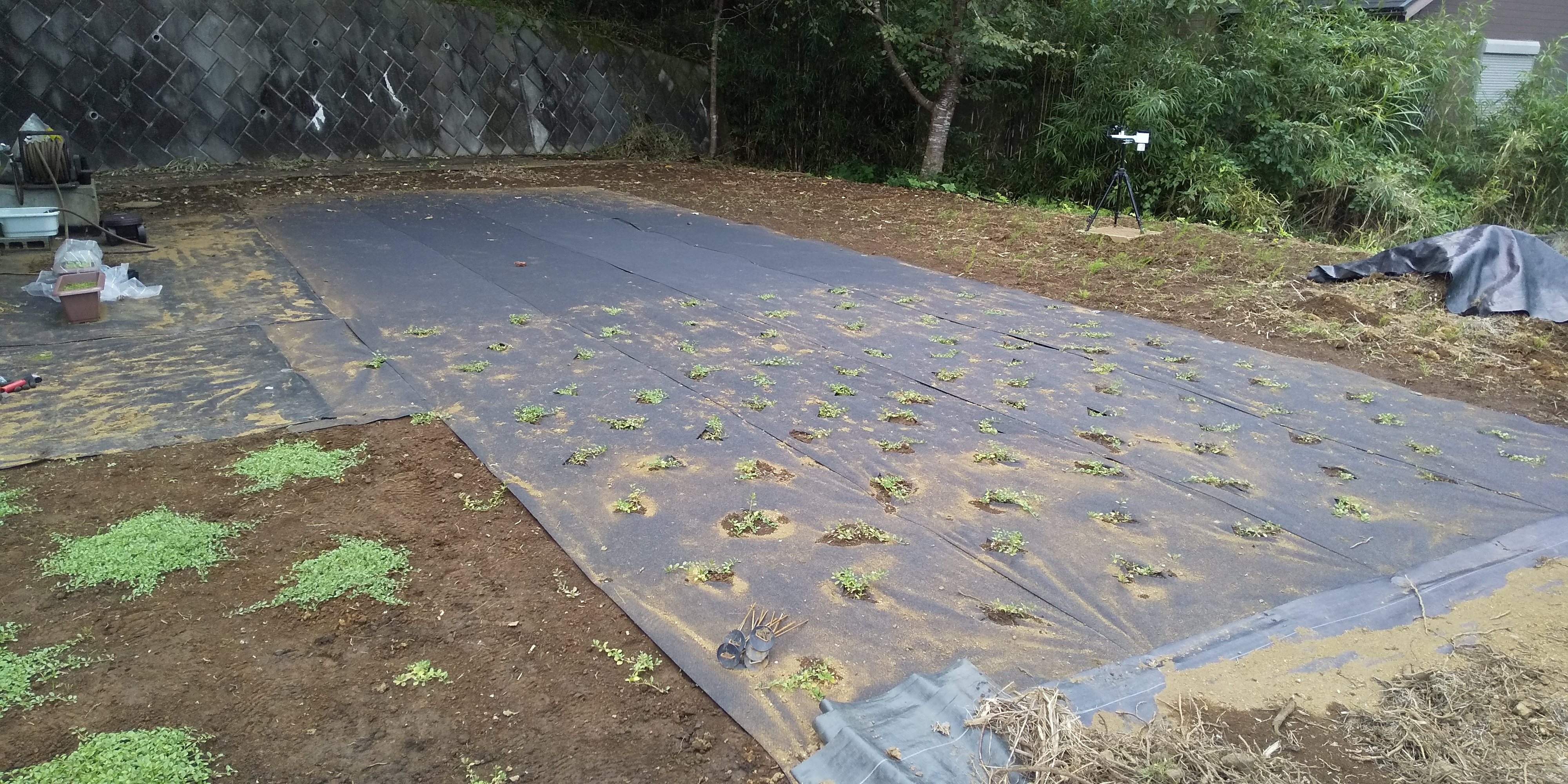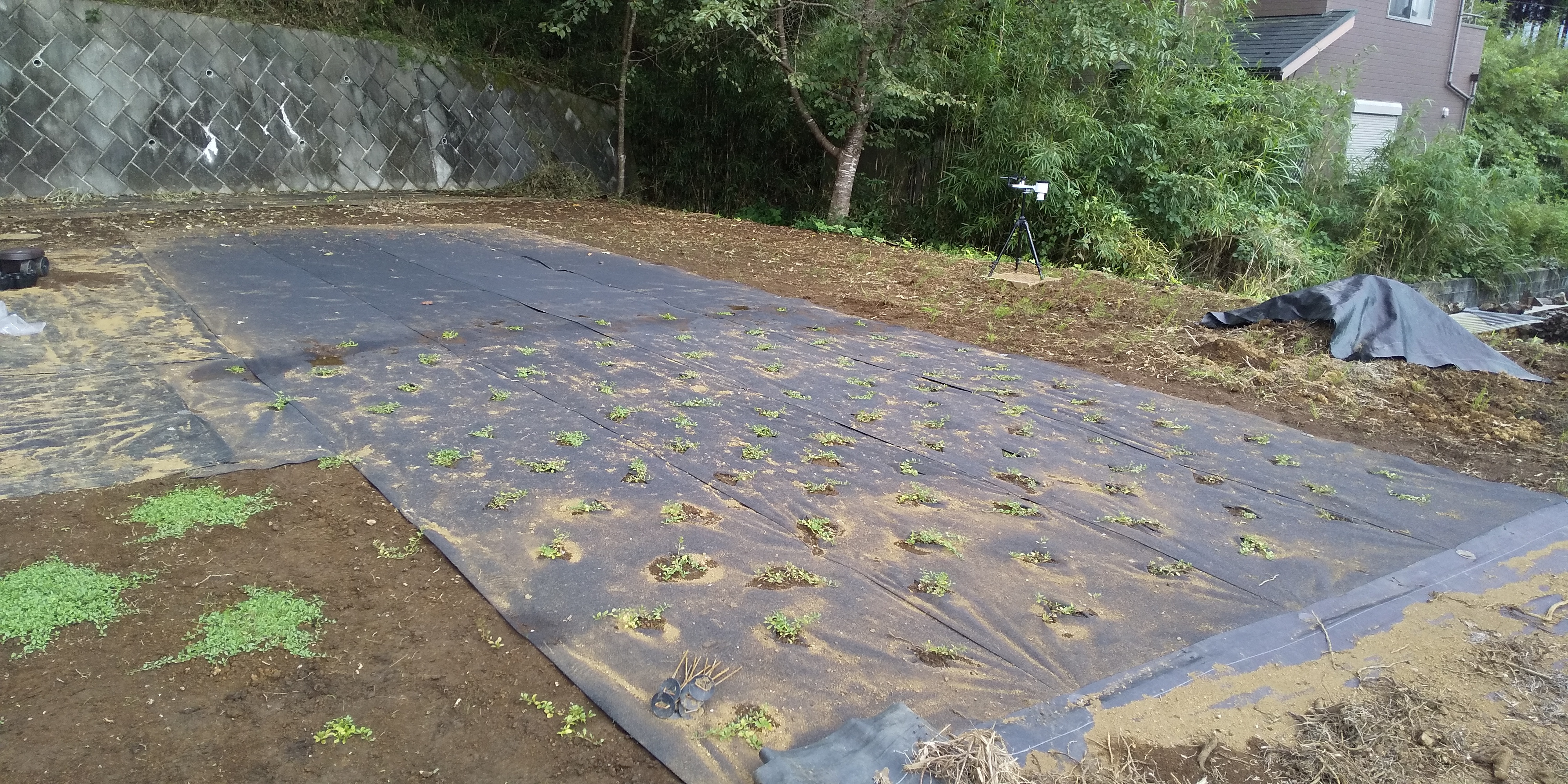 場所は先日あぜシートでひな壇にした上の段の部分に22ポット。残りの10ポットは植栽シートに定植中の続きの場所です。