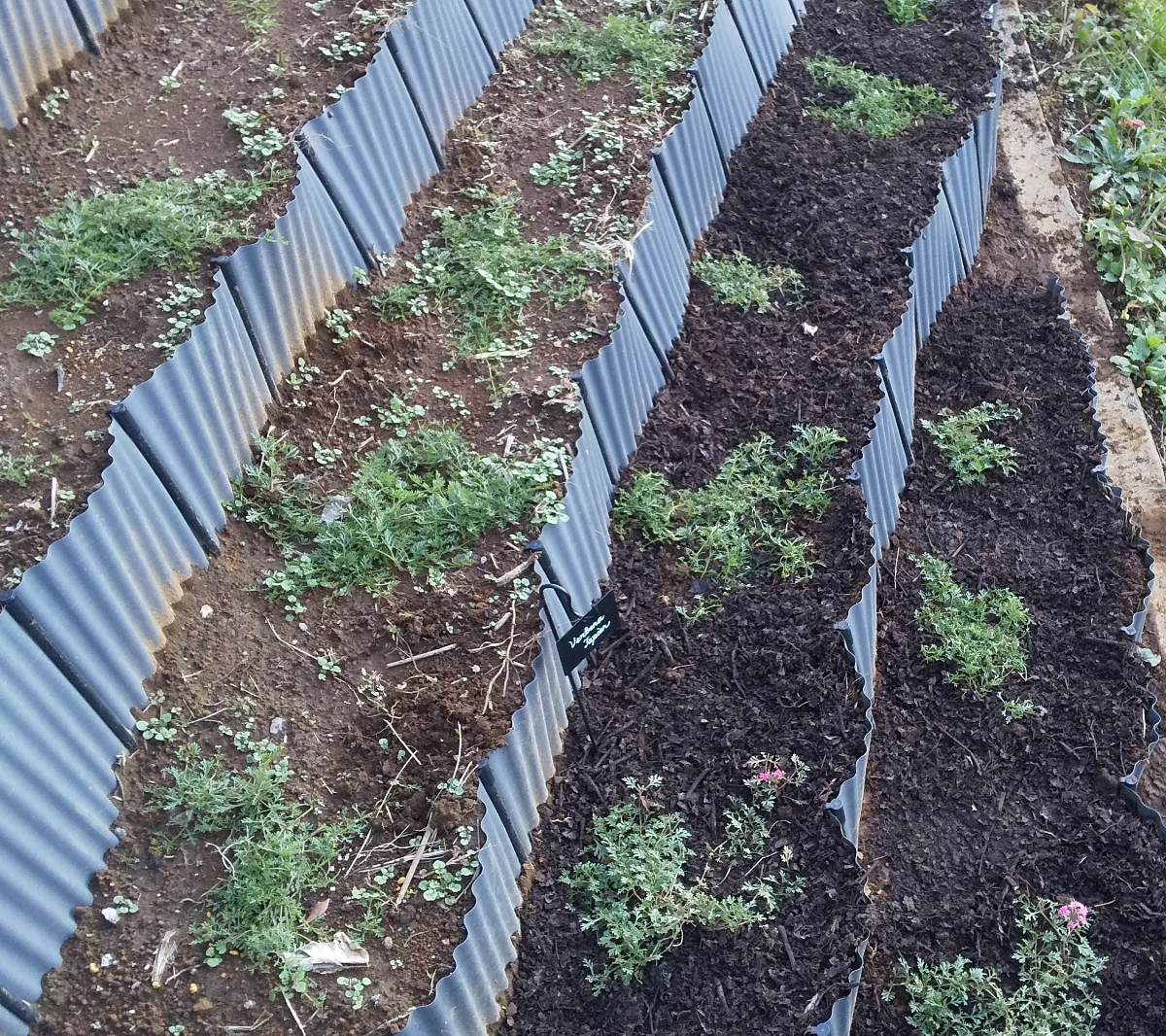段々花壇のタピアンもしっかりマルチング。