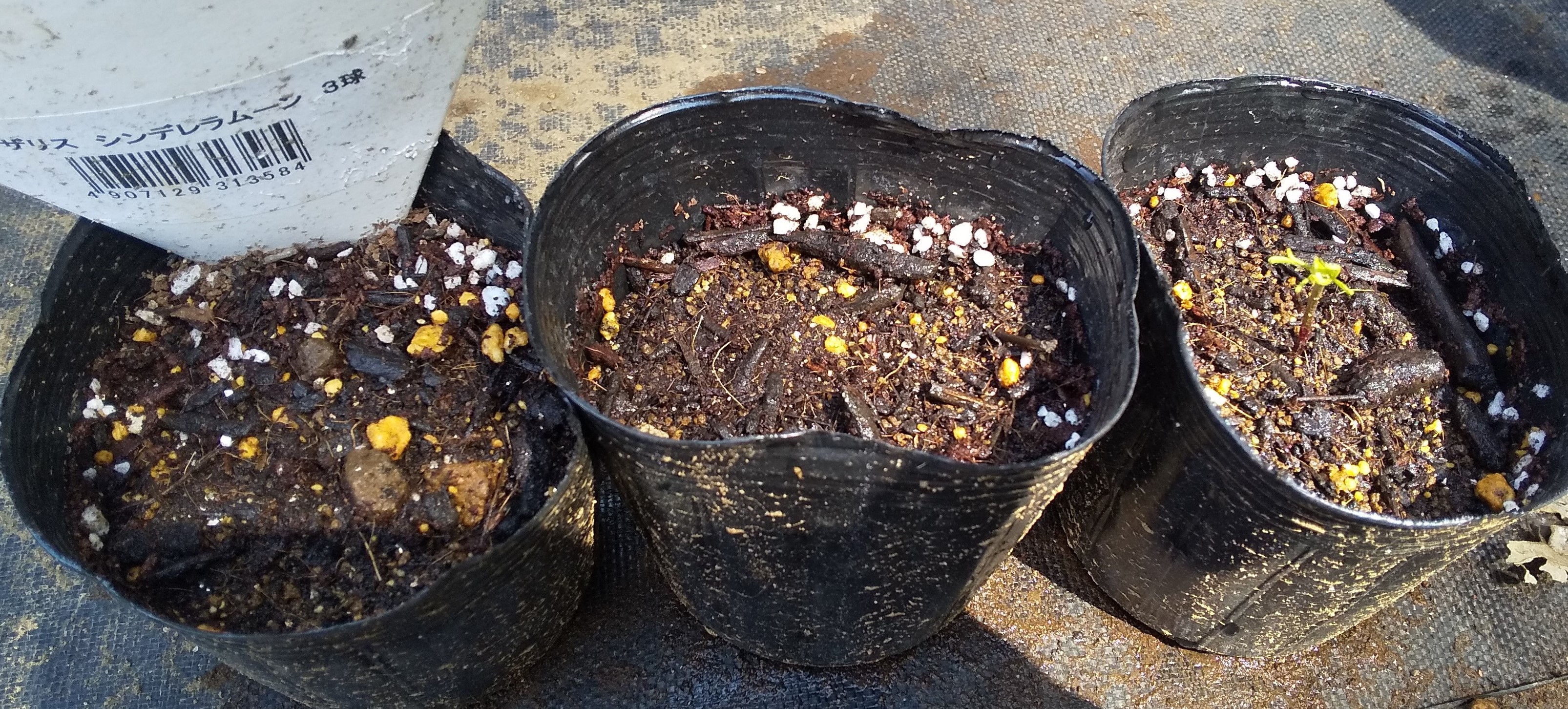 Life is Oxalis.~オキザリスの芽がでました!~ 2021 9/24 My Garden Notes ~庭ノート~ 2021年9月24日 8月30日に球根を植えたオキザリスのシンデレラムーン。 芽が出ました~! 2日ほど前に1つ目の芽がでて、今日、2つ目の芽が出ました。残り1つはまだ見えません。 一番右が最初に出た芽。真ん中のポットにも芽が出ていますが、まだまだ小さくて拡大してやっと見えるかな?くらいですね。 1年目は鉢植えで育てるのもアリという情報が多かったのですが、段々花壇もできましたので、地植えするか迷ってます。 いずれにしても元気に育ってくれるといいなぁ。 My Garden Notes ~庭ノート~ よかったらシェアしてね! URLをコピーしました! URLをコピーしました! コメント コメントする コメントをキャンセルコメント ※ 名前 ※ メール ※ サイト 次回のコメントで使用するためブラウザーに自分の名前、メールアドレス、サイトを保存する。 上に表示された文字を入力してください。