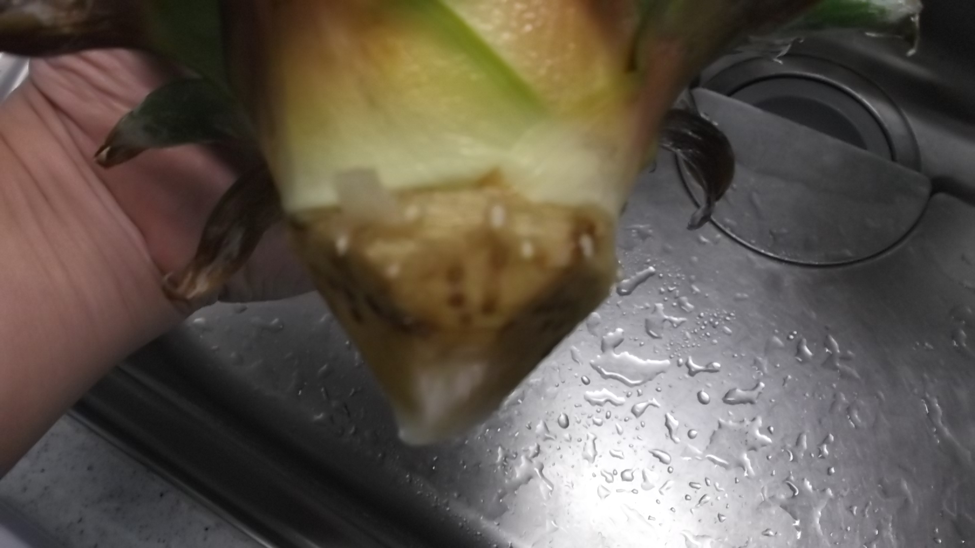 というのも、パイナップルの根は、この葉をむしり取った場所。元々葉が生えていた場所から生えてきます。
