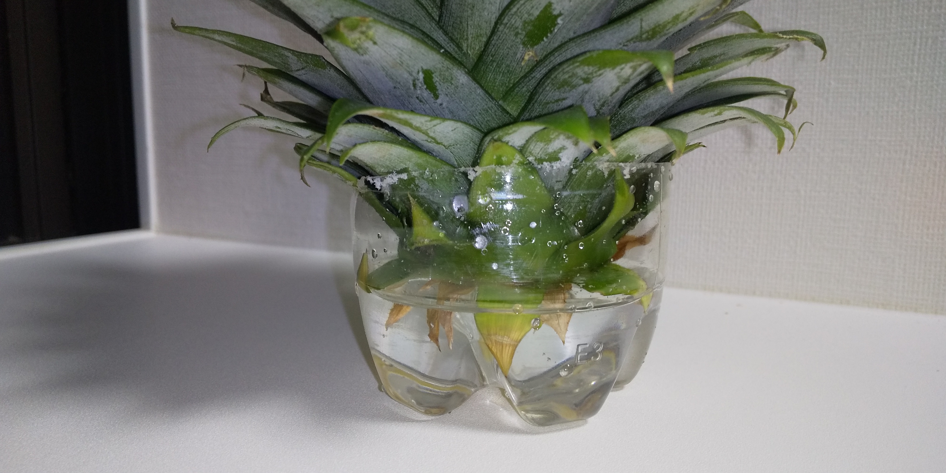 冠芽を水に差しておくとパイナップルは簡単に発根して、その後そのまま育てることができるという事で早速チャレンジしたのですが、結論から言うとこの写真の方法は間違っています。