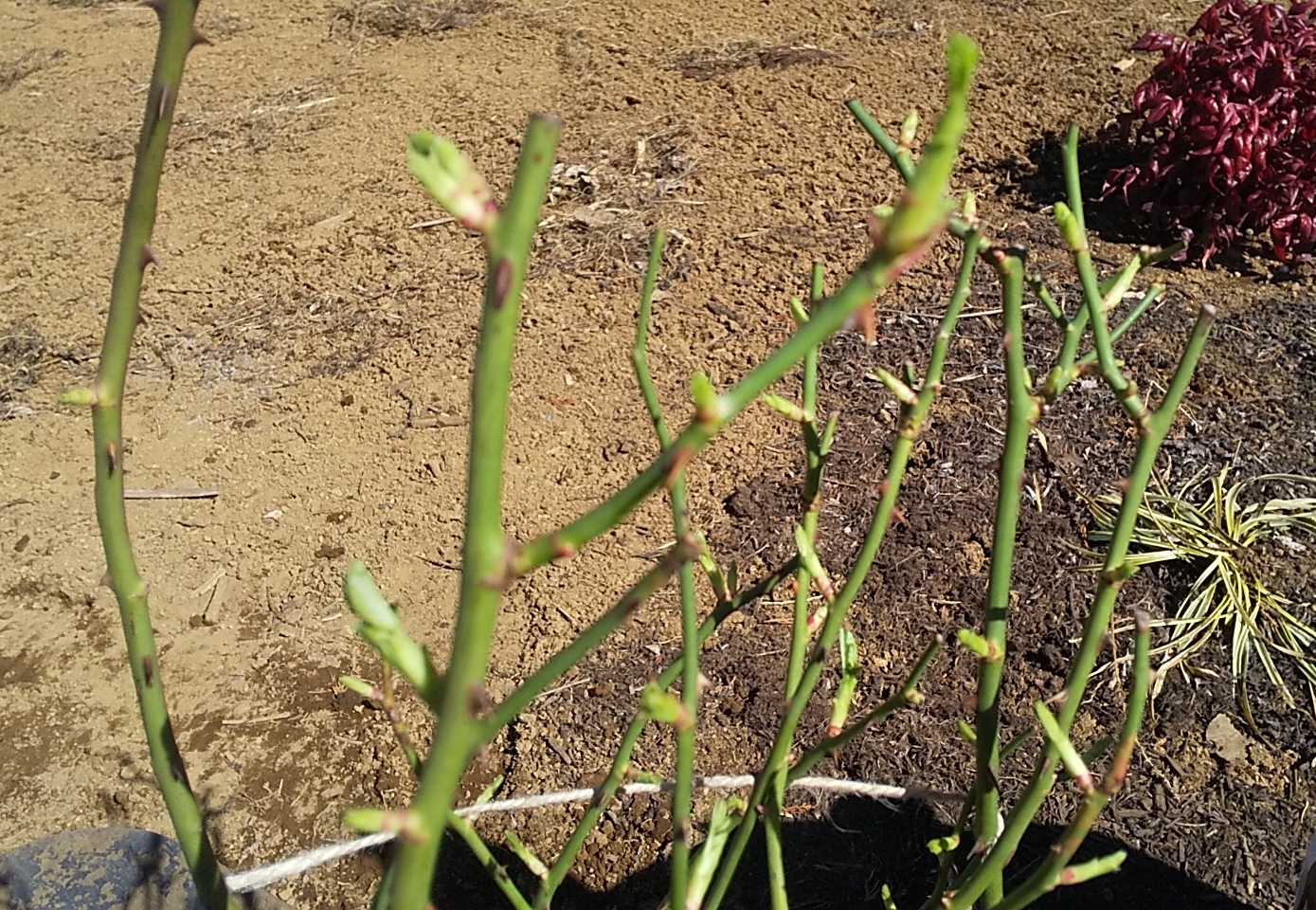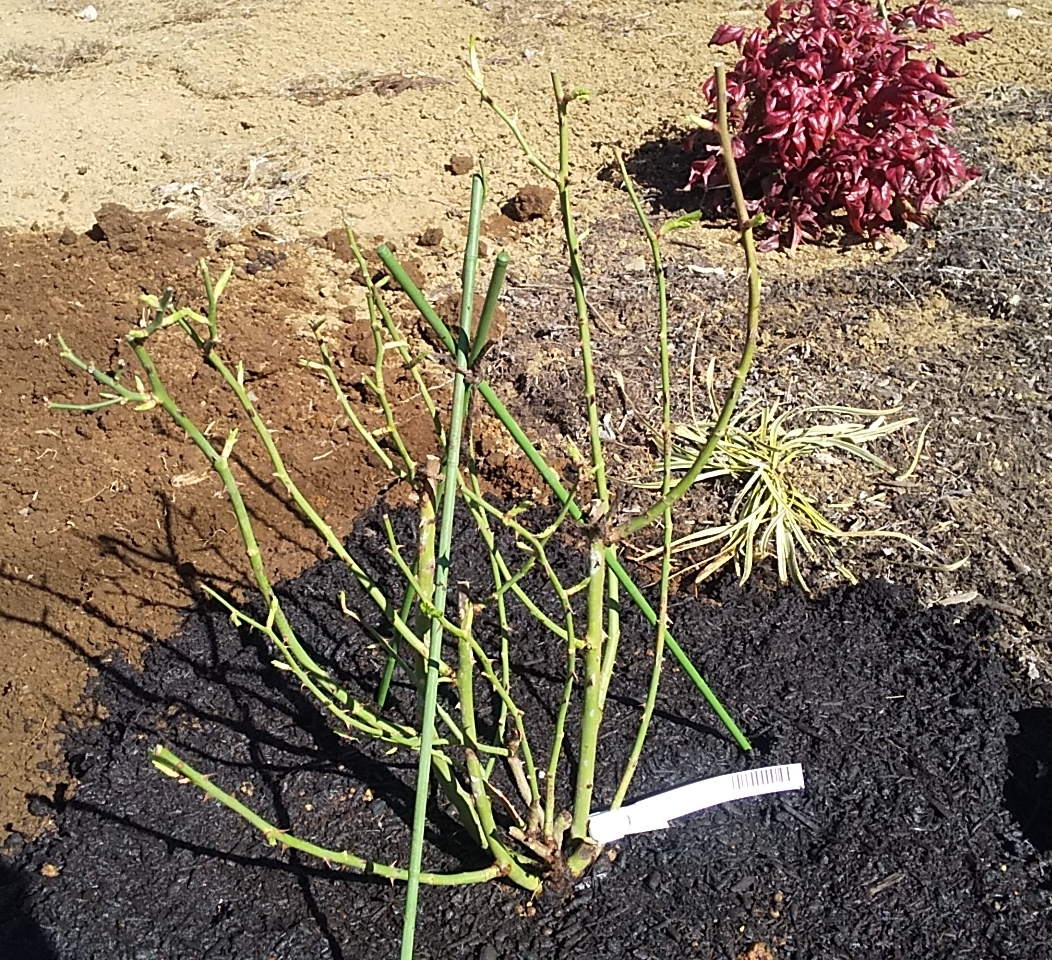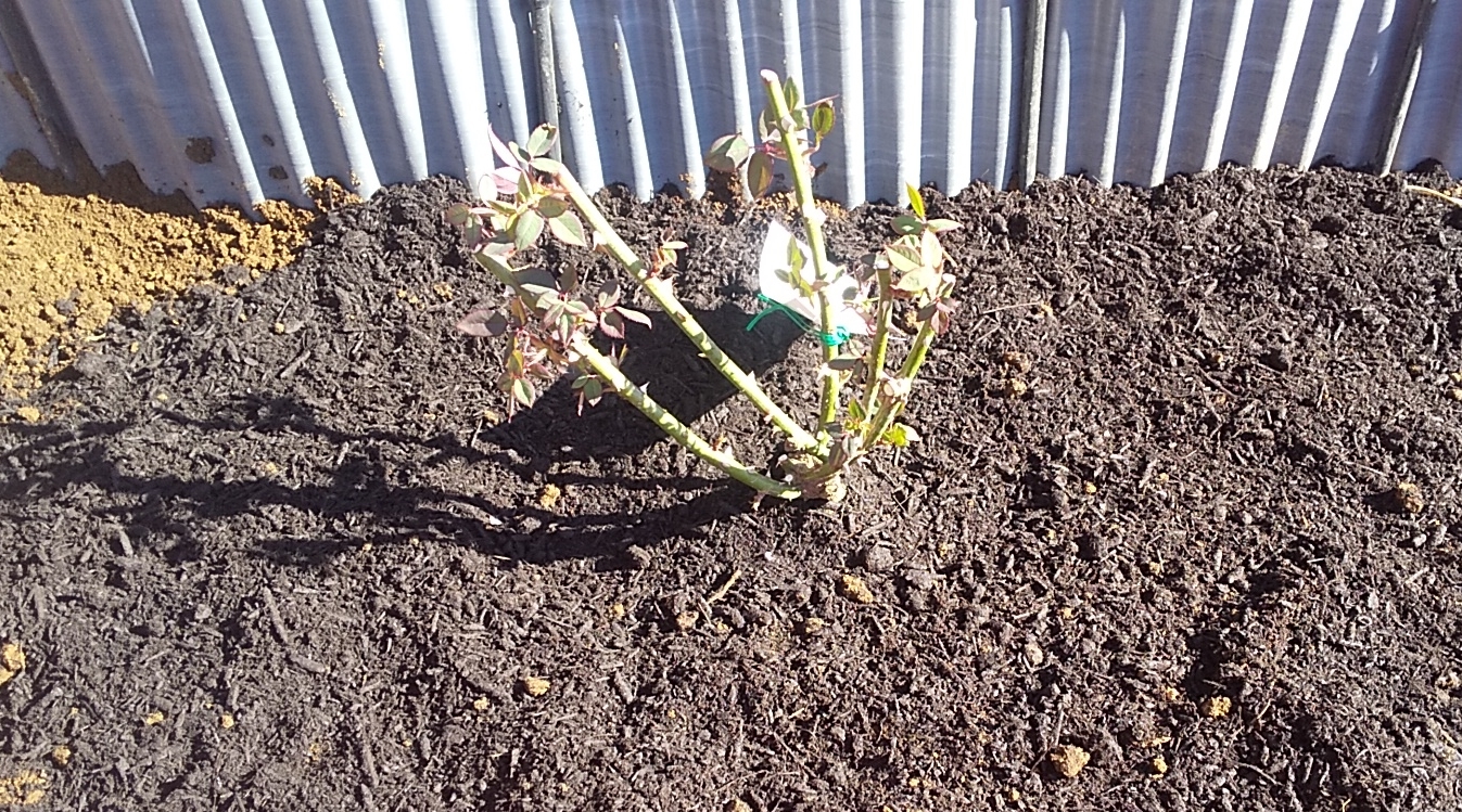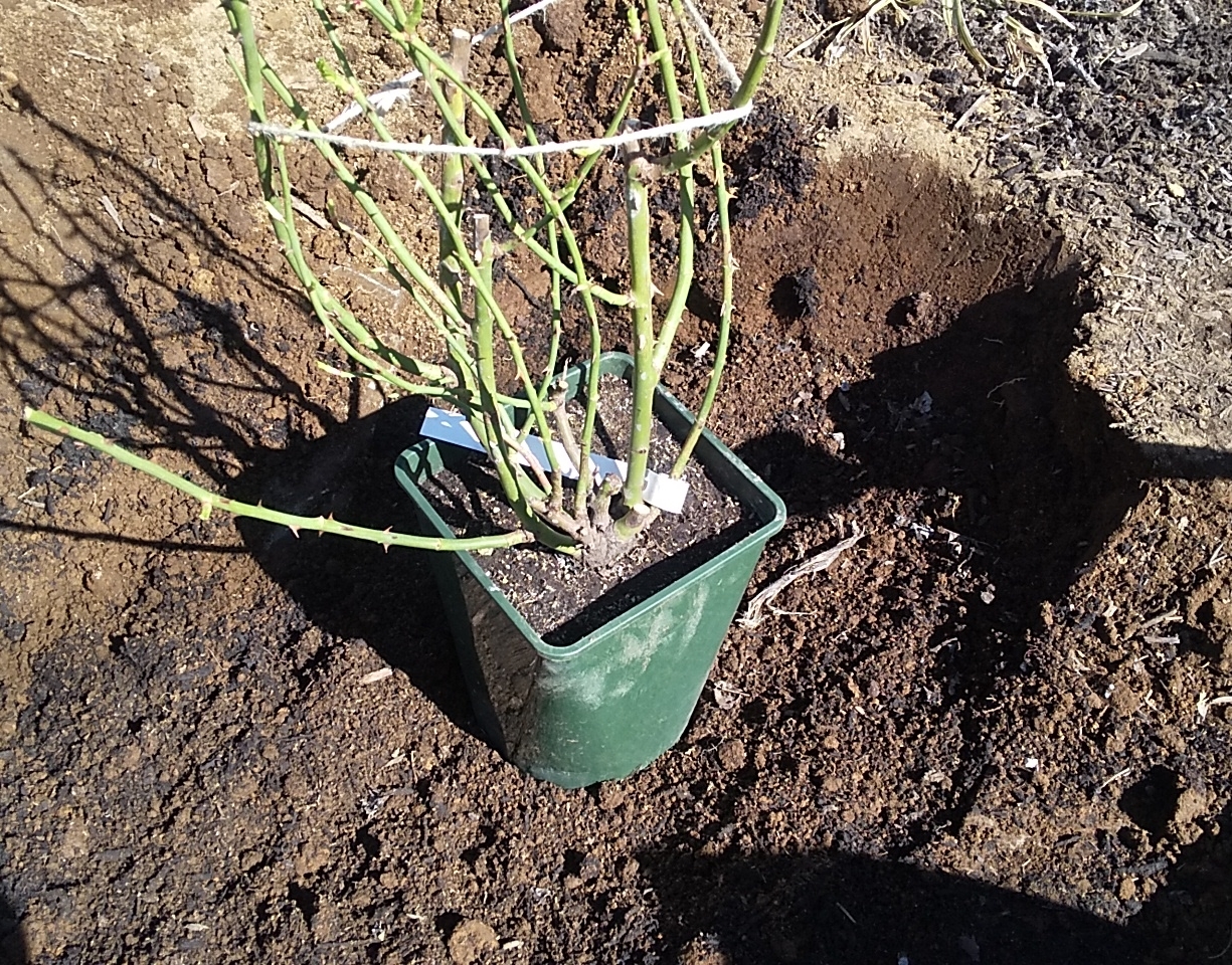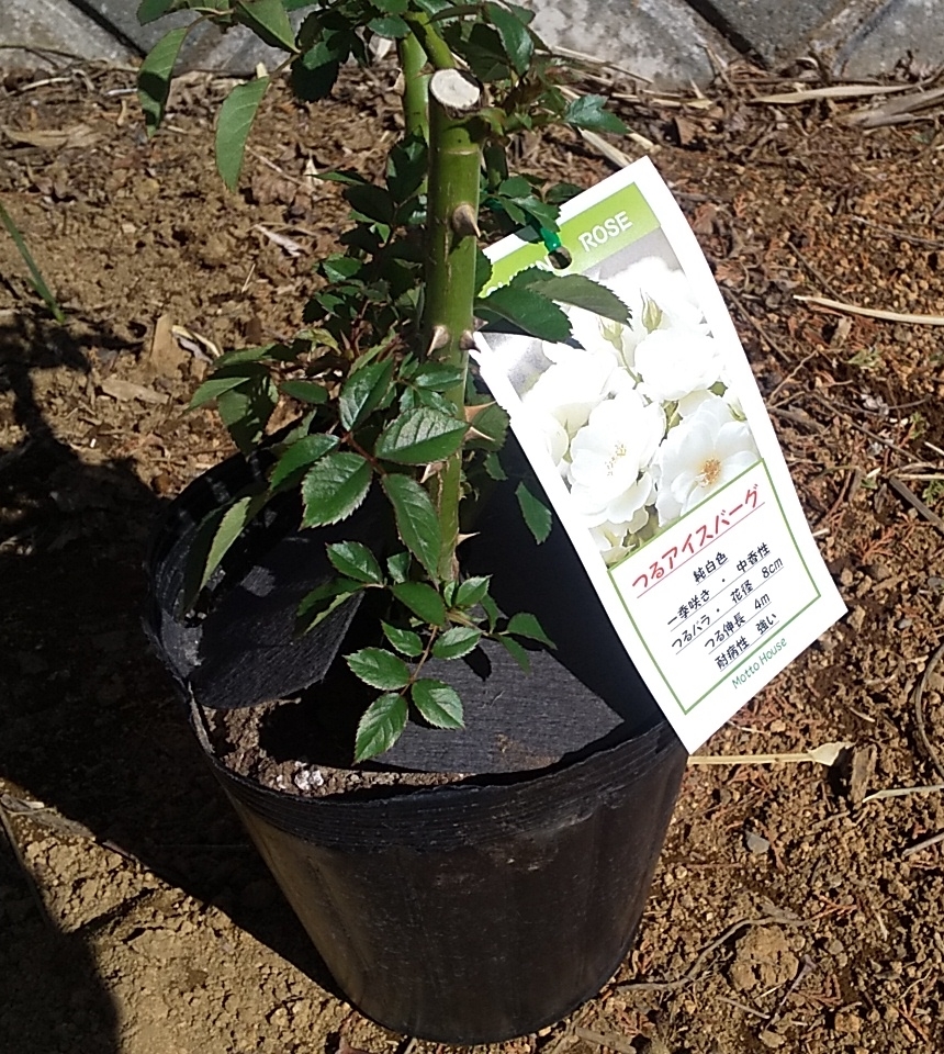 購入時点で葉がついていたことと、予想を超える寒さ(-6℃以下)が定期的に訪れ続けていたため、寒さに強いバラと言えども植え付けてすぐの―5℃以下はいかがなものだろうなどと迷っているうちに、つるアイスバーグとつるレディヒリントンの2本は購入後1か月以上経過。後から届いたアンジェラはすっかり芽吹いてしまってさらに寒い中で植えにくくなり…。