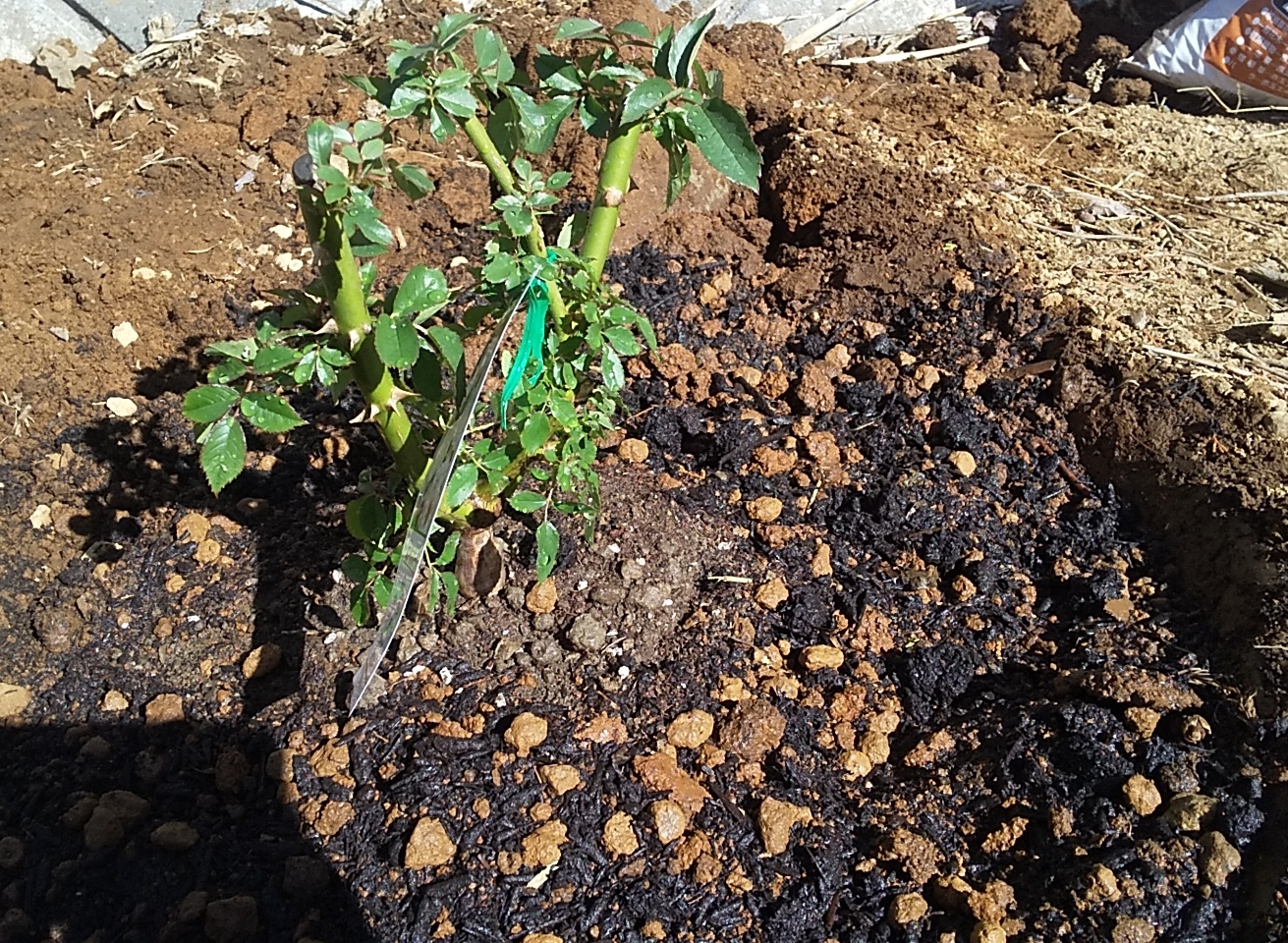 掘った穴にバーク堆肥と牛糞堆肥を多めに入れて、元肥にペレット鶏糞を一握り。土とよく混ぜます。混ぜている写真の上下の四角く見えているのが問題のコンクリートです。少し土を足して深さを調整して、植えました。