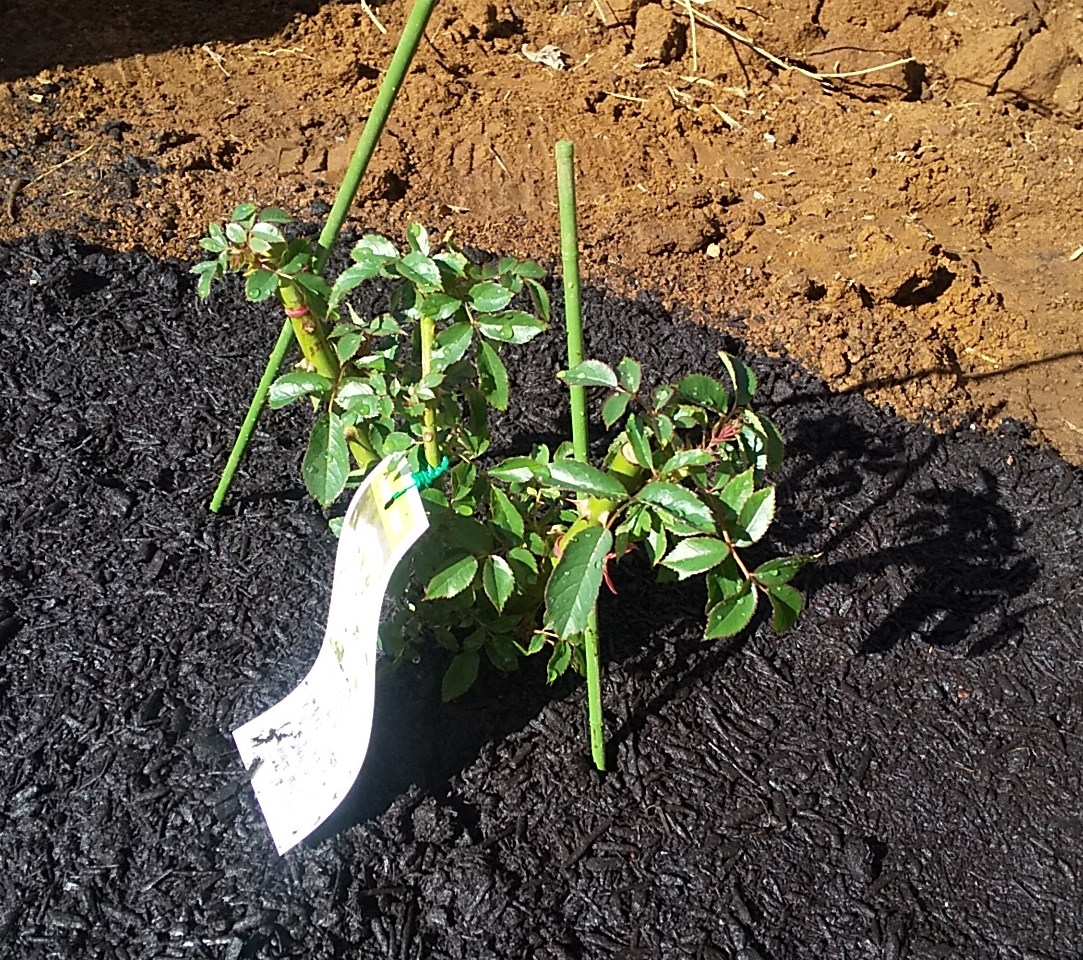 最後にバラの根元を広めにバーク堆肥でマルチングして、支柱を立てて完成。