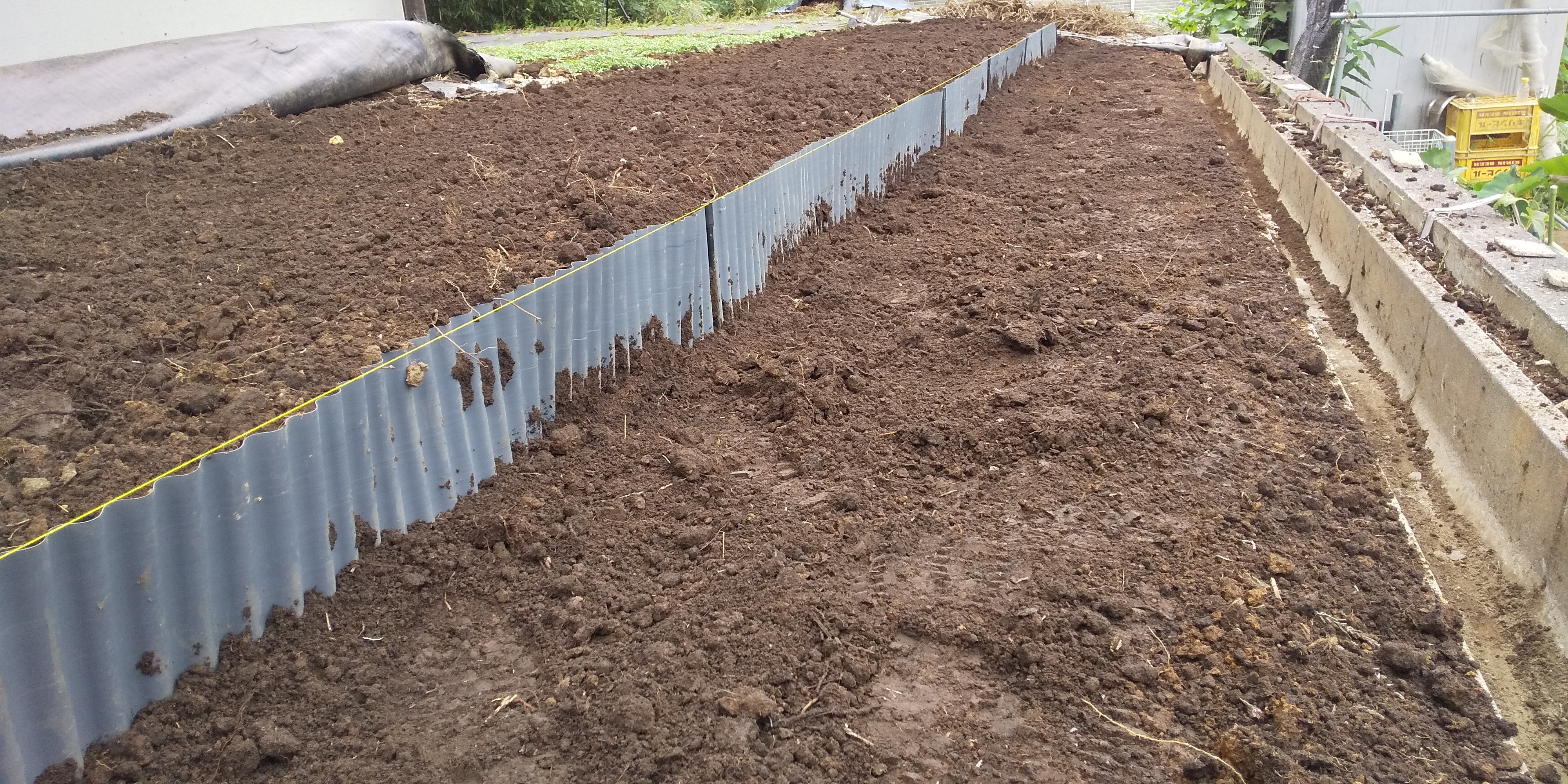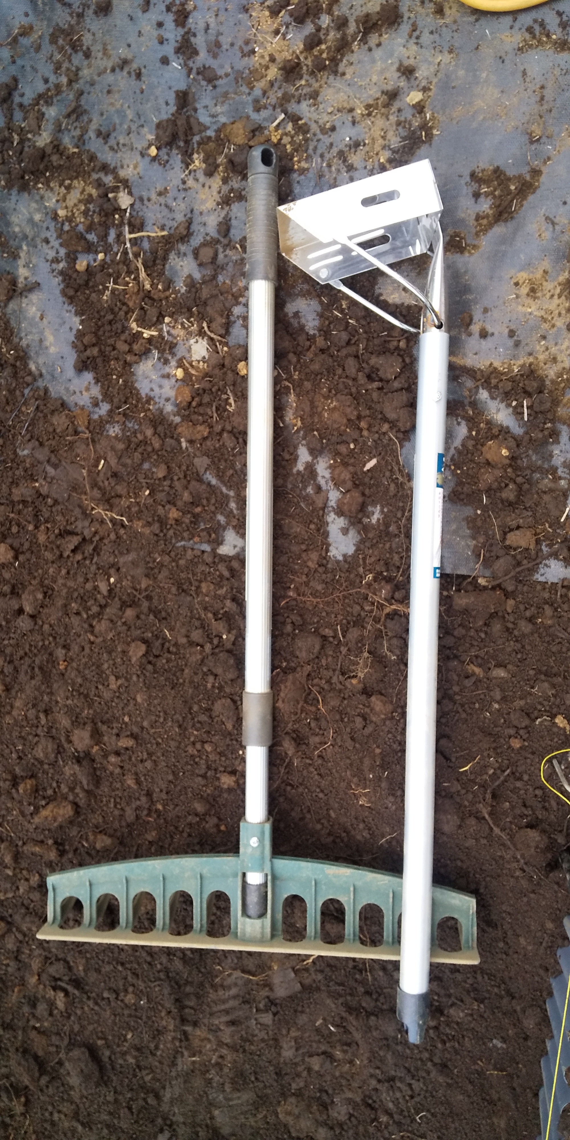 その後、全体をレーキの剛君で均します。剛君も軽くて使いやすくて、レーキとしてもトンボとしても、熊手の代わりとしても使えるので、購入後まだ3か月なのに使い過ぎてボロボロになってきてます。(笑)
