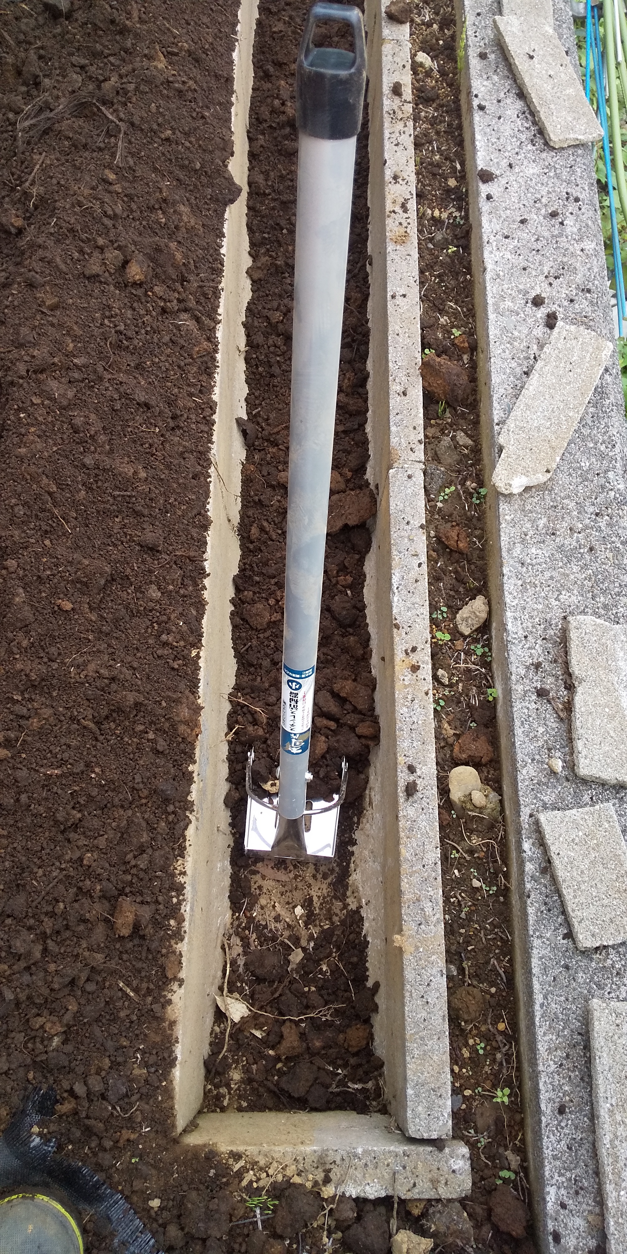まずは軽部さんで一気に全体の土の塊を砕きつつ、崩していない部分の固まっている土をほぐします。