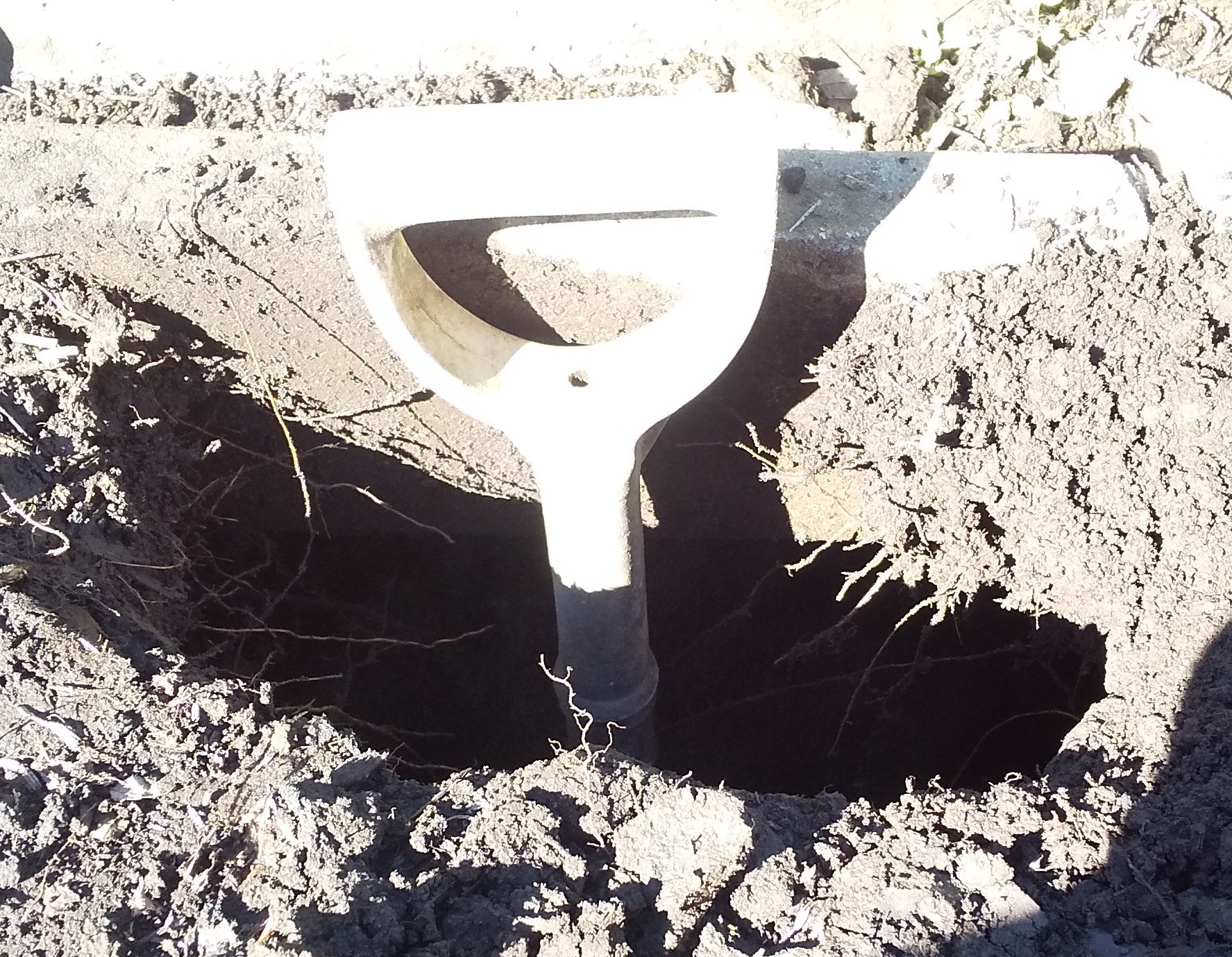 穴だけの写真だとよくわからないと思って、スコップ入れてみましたが、このくらいの深さです。