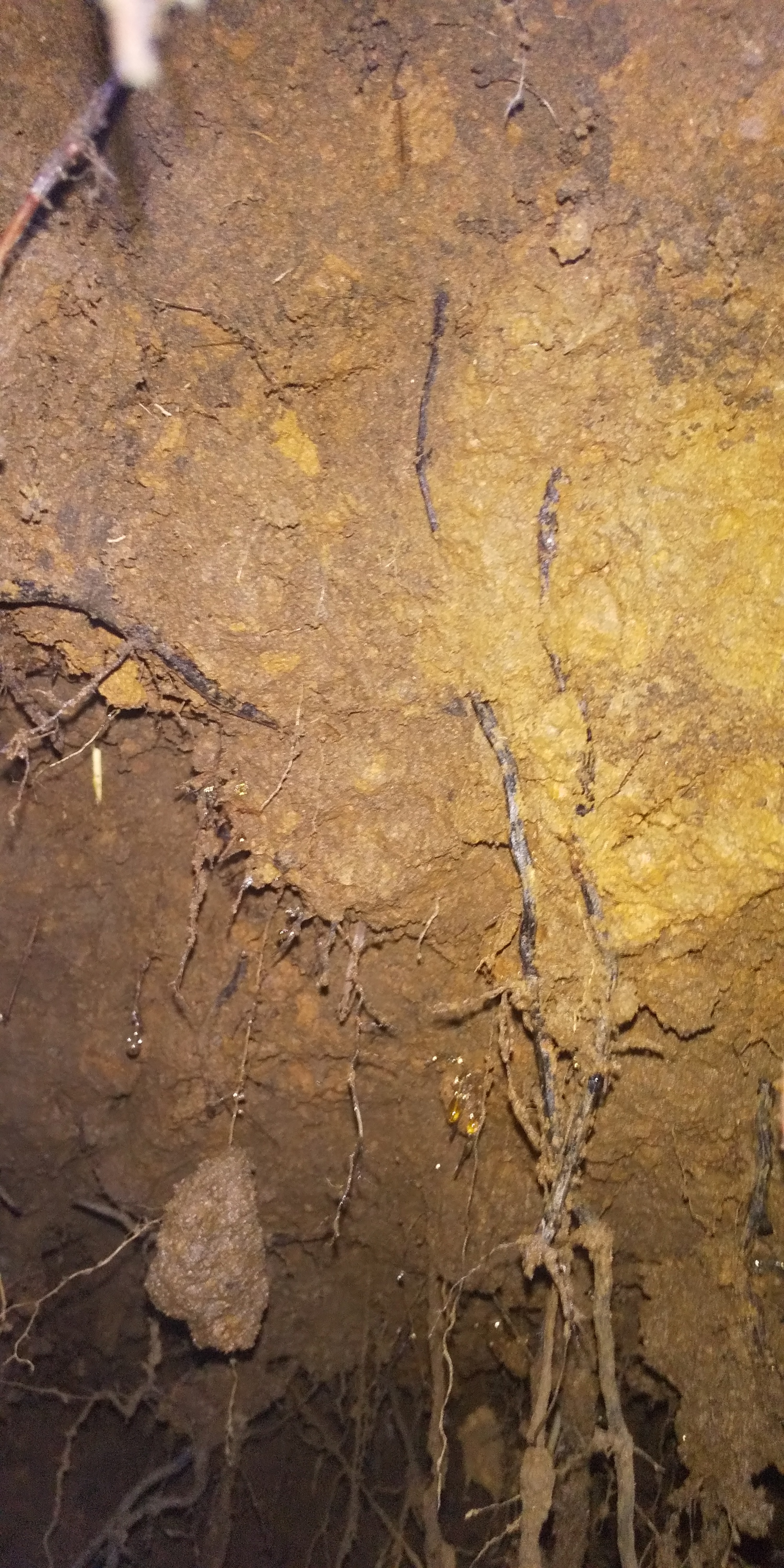 おそらく、長年の雨で土が流れ出てしまい、地下に空間ができてしまったところを植物の根(たぶんスギナの根)が支えているのではないかと思われます。